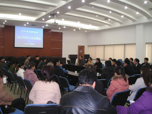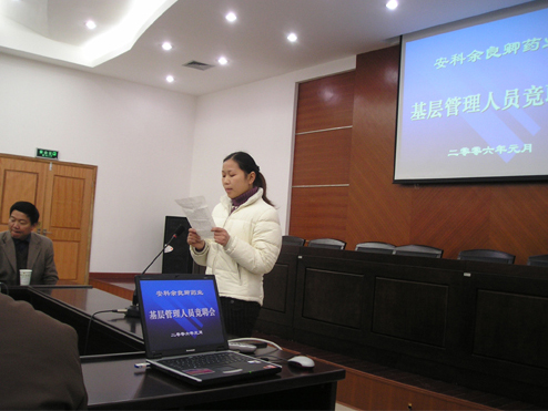作为管理人员竞聘活动的一项重头戏,2006年1月14日上午,公司开展了基层管理人员竞聘会。此次公开招聘三大制剂车间的9位班组长,共有17名员工报名参加了活动。竞聘采用发表竞聘演讲、民主测评、生产部门管理者评议的方式,各位竞聘者纷纷对班组管理提出了积极的设想、建议,表现出了较高的综合素质。