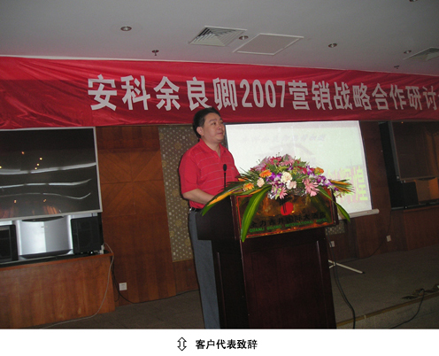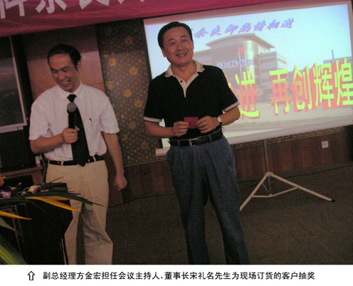 38家商业客户单位派代表参加了此次会议,公司董事长宋礼名先生亲临会议发表了热情洋溢的欢迎辞,并为现场订货的客户抽取一等奖;总经理谢红星向来宾介绍了公司的历史文化和发展前景;副总经理邓兆旭则就公司产品特性及销售政策方面的内容做了陈述,主持人由副总经理方金宏亲自担纲;公司领导程新霞和全体营销人员也出席了会议。会议还邀请了部分客户代表上台发言,并以公司概况及产品知识为内容举办了有奖问答和抽奖活动,来宾们踊跃参与、积极响应,将会场的热烈气氛推向了高潮。