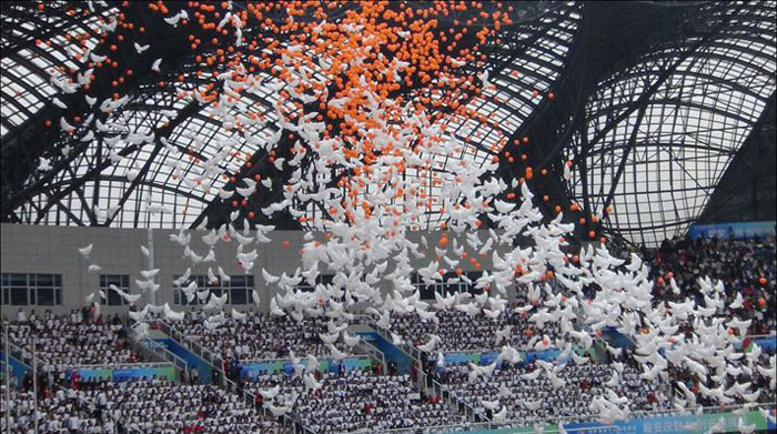本届省运会是安徽省规模最大、规格最高、竞技水平最强的一次综合性体育盛会。全民参与、观众互动是本届省运会的一大亮点。能容纳近4万名观众的安庆体育中心体育场座无虚席。现场气氛激昂,传统与现代相结合的大型群体表演获得了观众们的阵阵喝采。